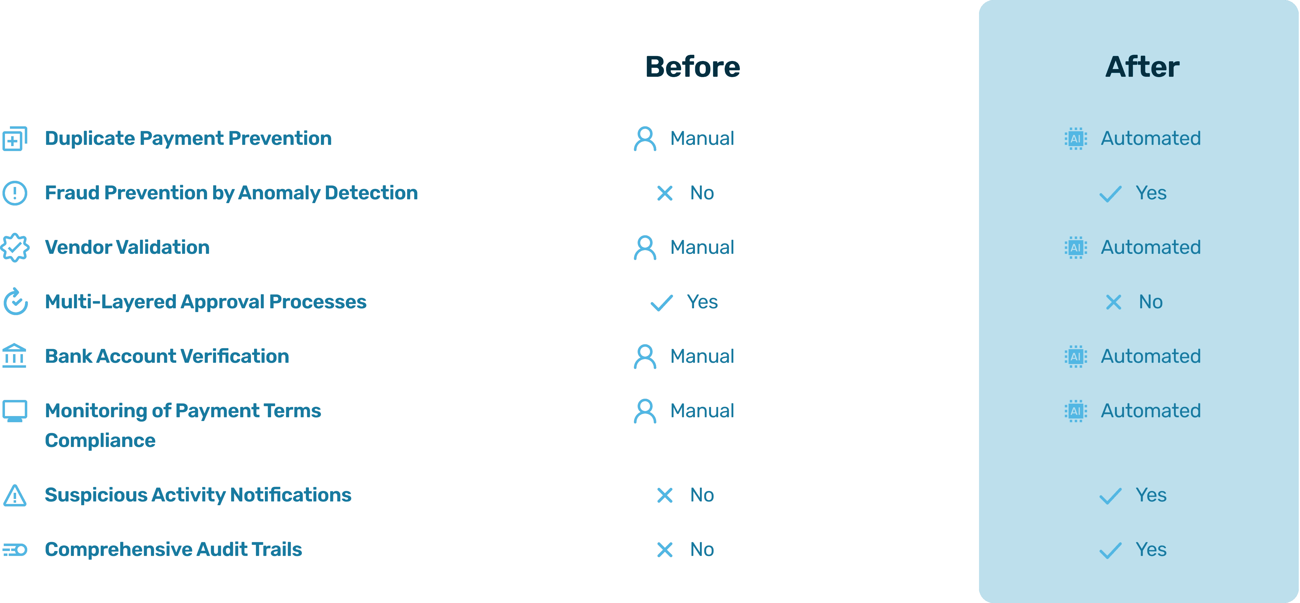 Checks for duplicate payments, verifies vendor and bank details, and provides real-time alerts to reduce risk and safeguard cash flow.