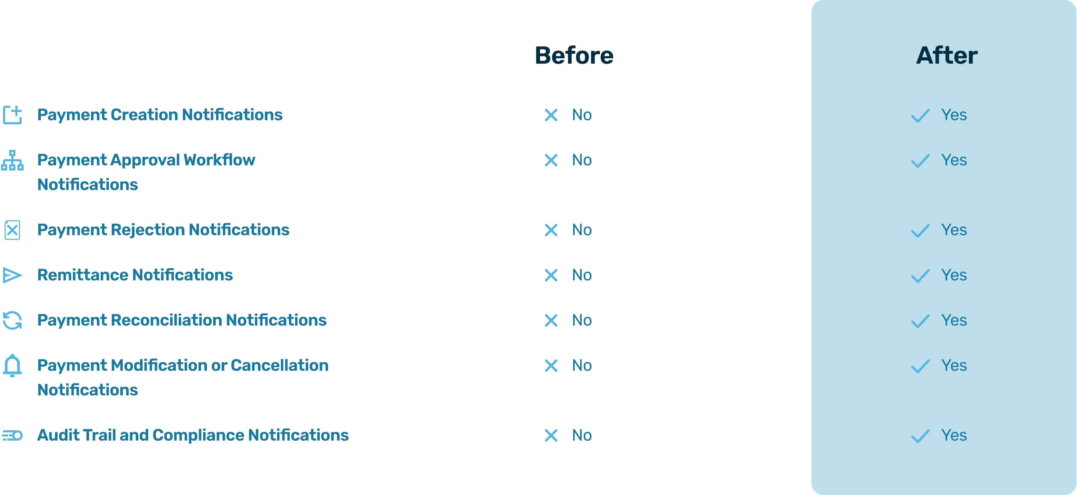 Notifies users of payment creation, approvals, rejections, and reconciliation events to support automated vendor payments and accurate tracking.