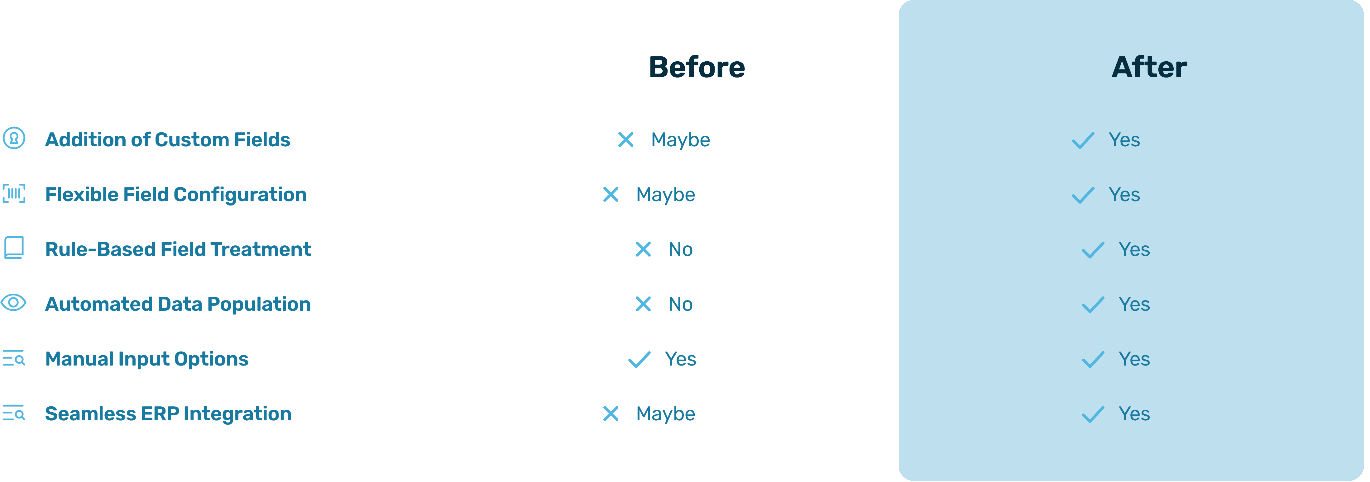 Each custom field can follow set rules, filled manually, auto-filled from metadata, or pulled from ERP data, ensuring consistent and accurate inputs across forms.