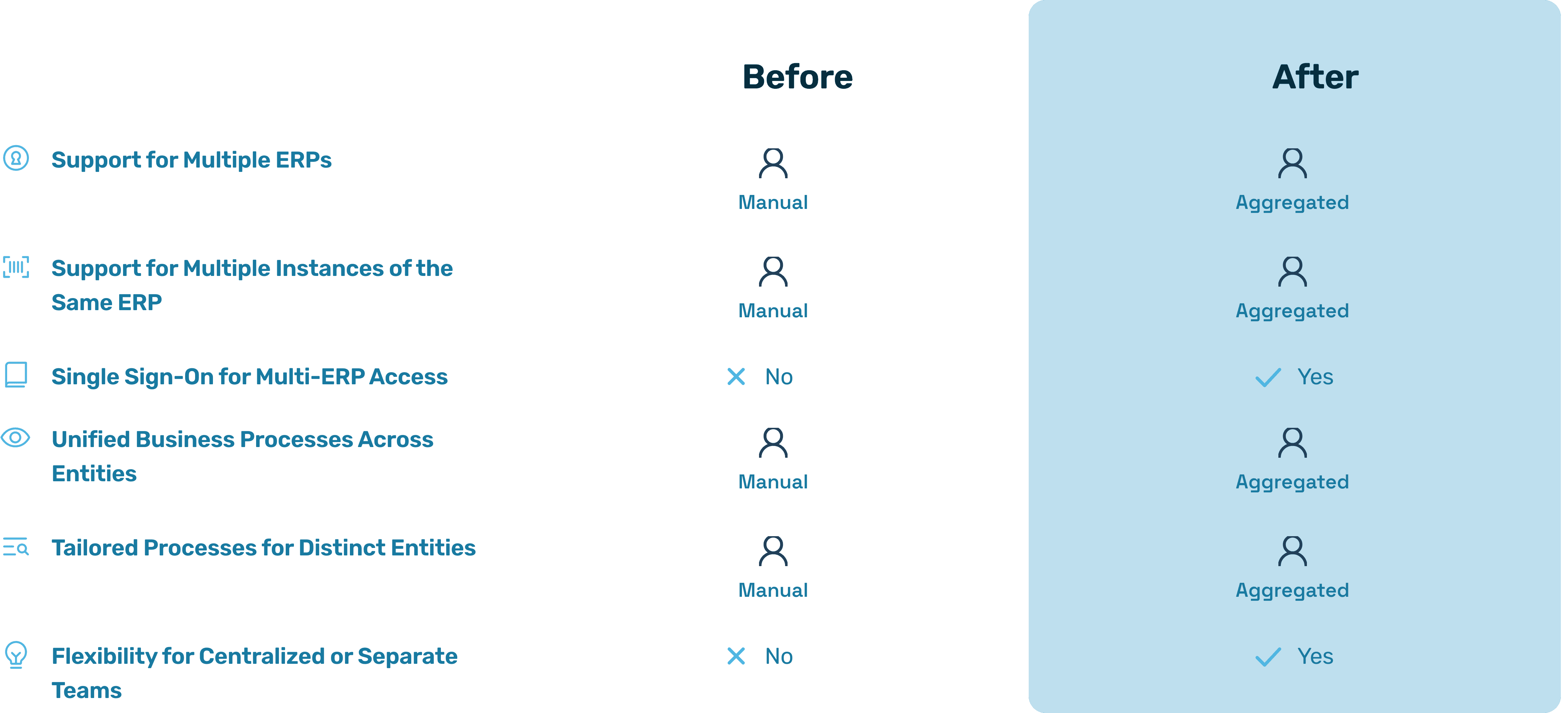 Enables access to all ERPs and entities with a single login, reducing the need for multiple credentials and streamlining workflows for finance teams.