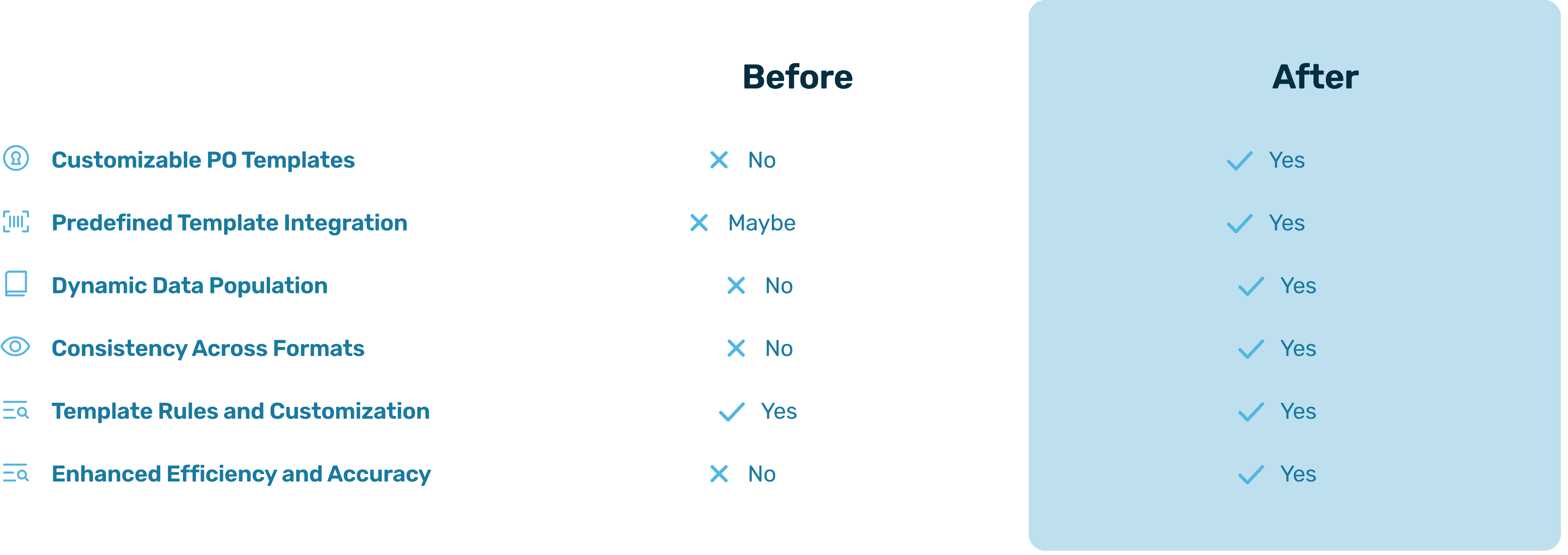 Standardizes PO design and layout to ensure every purchase order looks consistent, reducing confusion and making reviews easier for both vendors and internal teams.