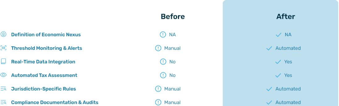Captures each step, from monitoring thresholds to calculating taxes, creating a clear audit trail that supports compliance and simplifies audits.