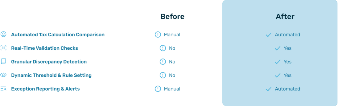 Detects mismatches between calculated and invoiced tax amounts, down to individual line items, enabling faster resolution and clean audit trails.