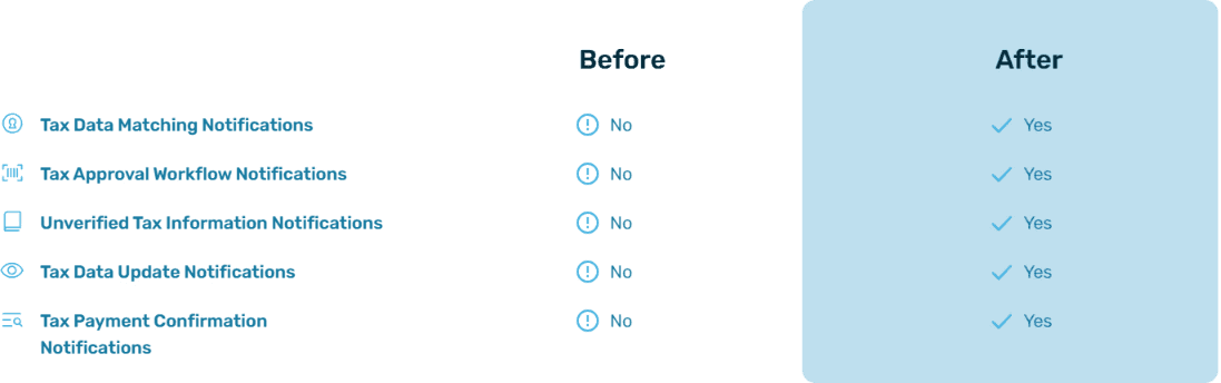 Unverified Tax Information Notifications are sent when vendor or transaction tax details remain unverified or incomplete. These alerts ensure that stakeholders can promptly address and resolve any issues, preventing compliance delays.