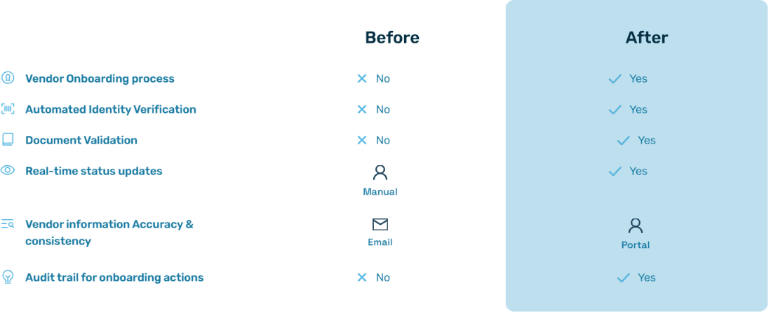Reduces manual steps by automating data collection and verification, helping teams maintain consistency and save time during vendor onboarding.