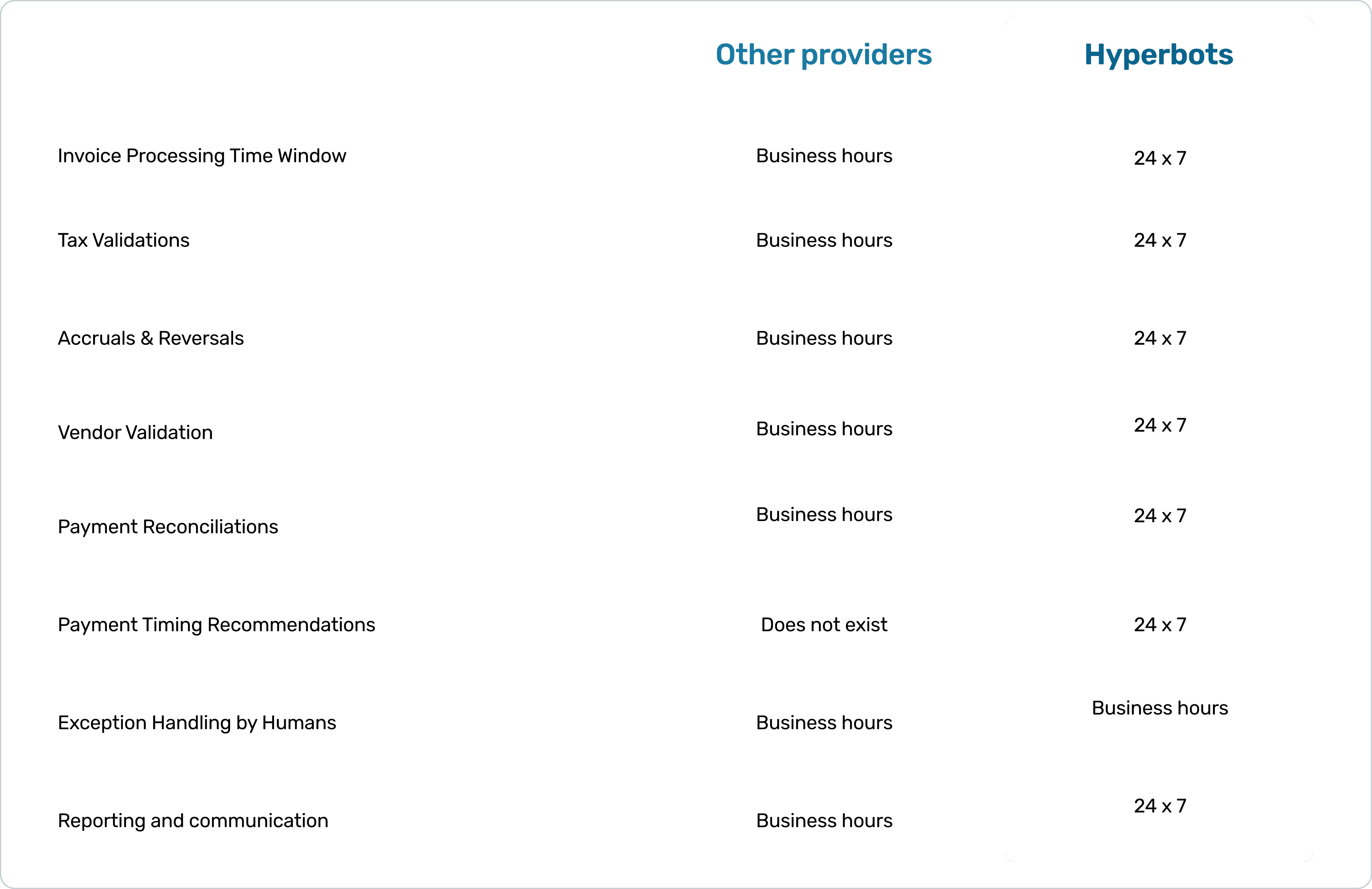 Yes, Hyperbots Co-pilots operate 24x7, processing tasks continuously without being constrained by human working hours.