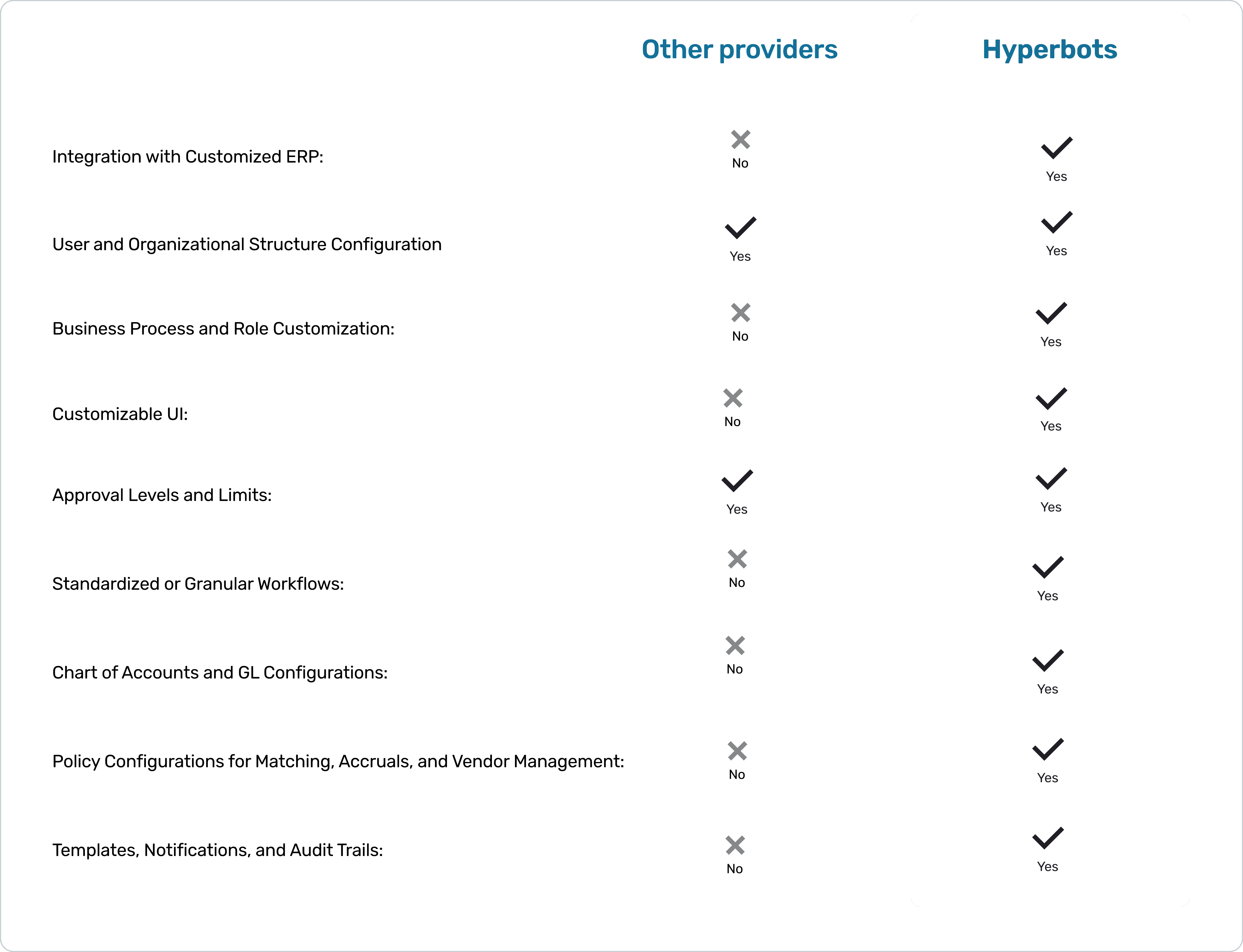 Hyperbots Co-pilots offer extensive company-specific customizations, including ERP integration, workflows, roles, UI, GL structures, and matching policies, all configured through a no-code framework.