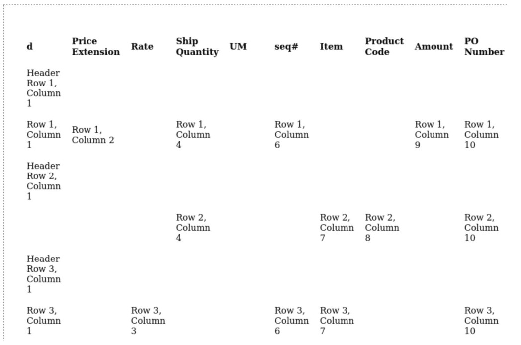 Figure 3: Sample document image generated by TemplatePy containing a synthetic table. Column headers are randomly as- signed field names or aliases, and cells are filled with placeholder text representing structured information. This layout-agnostic design preserves structural logic while obfuscating content, enabling privacy-preserving, domain-aligned training of VLMs without reliance on real invoices.