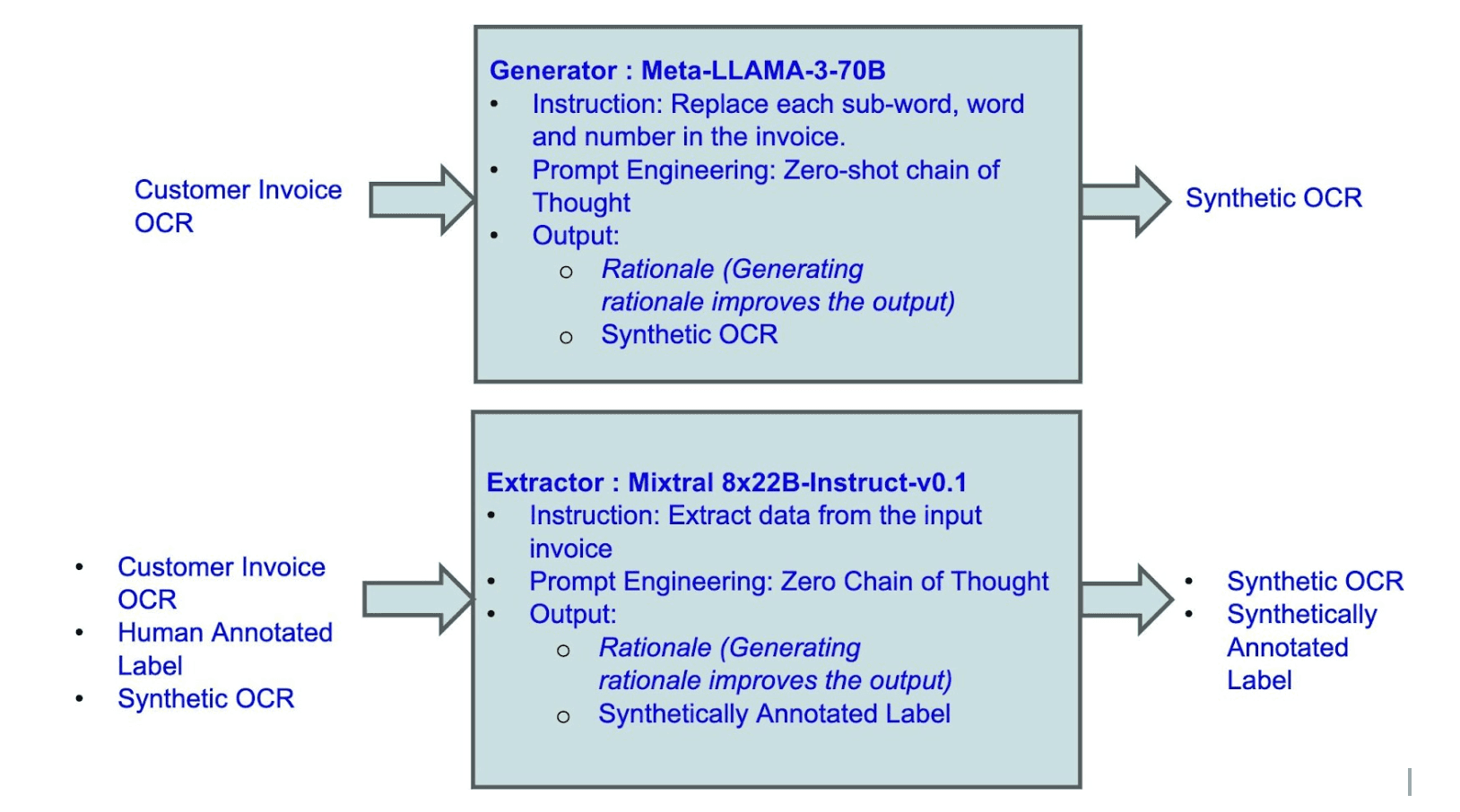 InvoicePy is a synthetic data generation framework for training LLMs on invoice information extraction. It takes <OCR, Human Annotated Label> as input, where ‘OCR’ is the OCR model output for a real customer invoice and generates <Synthetic OCR, Synthetically Annotated Label> samples, where the ‘Synthetic OCR’ simulates OCR model output while preserving the layout and content structure of the customer invoice. Serving as a privacy-preserving anonymization layer, InvoicePy generates obfuscated but structurally faithful data, enabling domain-aligned model training without exposing sensitive information. The framework has two stages (Refer to Fig 1 in the Appendix): (1) Generation and (2) Extraction. In the generation stage, LLaMA-3-70B is instructed in a zero-shot Chain of Thought setup to generate a ‘Synthetic OCR’ from real customer invoice ‘OCR’ by replacing subwords, words, and numbers while preserving the original structure. A rationale is generated to guide output quality, and an optional second pass adds variability. In the extraction stage, Mixtral-8x22B-Instruct-v0.1 takes <OCR, Human Annotated Label, Synthetic OCR> as input and returns <Synthetic OCR, Synthetically Annotated Label> (Refer to Fig 2 in the appendix), resulting in final training pairs <Synthetic OCR, Synthetically Annotated Label>. Model choices are based on extensive experiments to ensure layout fidelity, annotation quality, and prevention of data leakage. Note that we use LLaMA-3-70B for the first stage and Mixtral-8x22B for the second stage because LLaMA excels at high-fidelity generative rewriting needed to produce layout-preserving synthetic OCR, whereas Mixtral provides cost-efficient yet reasonably accurate structured data