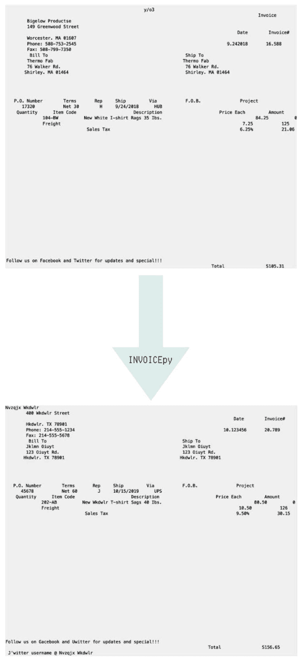 Figure 2: InvoicePy synthetic data generation process. The top shows a real invoice OCR model output, and the bottom shows a structurally aligned, anonymized ‘Synthetic OCR’ generated using LLaMA-3-70B, preserving layout while obfuscating con- tent. This enables privacy-preserving training of LLMs for invoice information extraction.